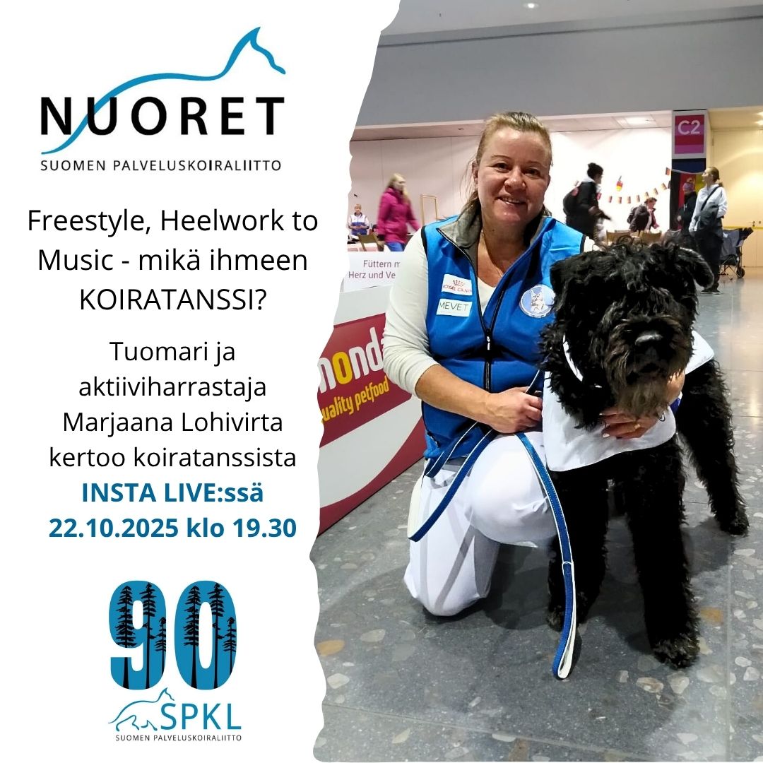 Palveluskoiraliiton Nuorten IG:ssä on tarjolla Insta LIVE aiheesta koiratanssi. Livessä koiratanssituomari ja aktiiviharrastaja Marjaana Lohivirta kertoo tästä kiehtovasta ja kauniista lajista sekä vastailee kysymyksiin.