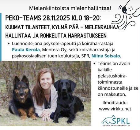 Luennoitsijana psykoterapeutti ja koiraharrastaja Paula Kerola, Mentera Oy, sekä keskustelukumppanina koiraharrastaja ja psykososiaalisen tuen kouluttaja, SPR, Niina Soisalo.
